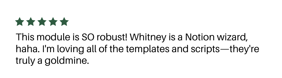 ✓ Bite-sized video lessons ✓ Templates ✓ Sales and Inquiry Scripts ✓ Notion Client Portal Template ✓ Worksheets & Action Plans ✓ 12 Monthly Coaching Calls